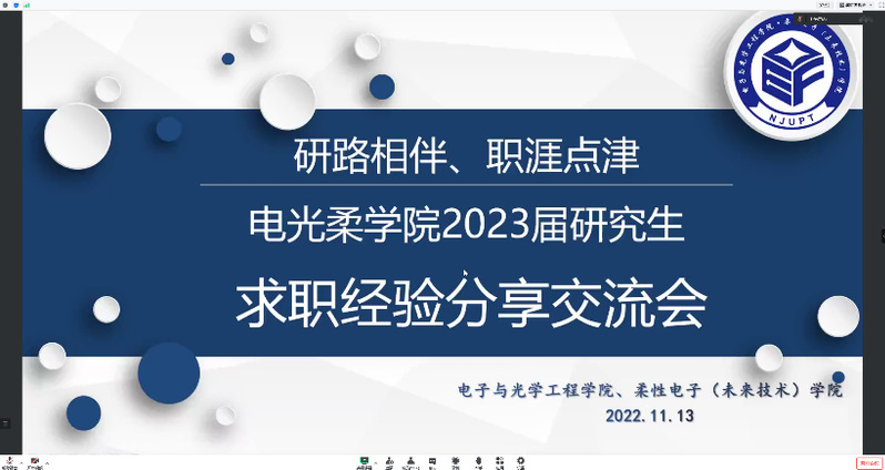为了增进学院同学对本专业就业领域和方向的了解,提升就业技巧,获取就业信息,11月13日上午,304永利集团官网入口、柔性电子(未来技术)学院举办了“研途有你,职涯点津”求职经验分享会。本次分享会邀请四位优秀校友作为嘉宾分享经验。学院党委副书记、副院长徐磊书记参加了本次会议,研究生全体辅导员及200名学生参会,会议由2021级电光柔院第二党支部副书记郭晔同学主持。