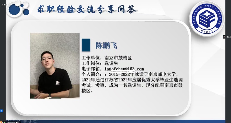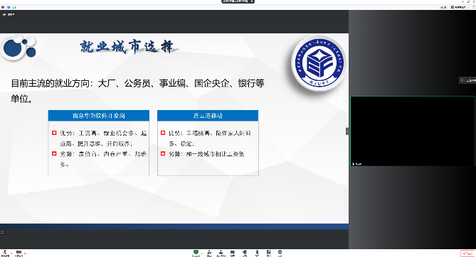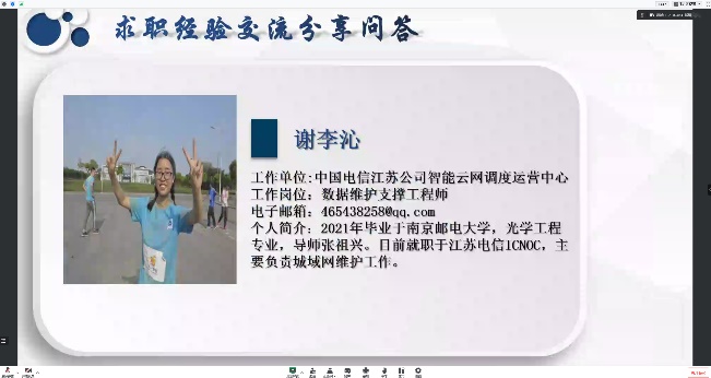 谢李沁学姐作为第一位嘉宾,从面试准备、求职准备及自身经验等三方面,给大家描绘了忙忙碌碌又井然有序的岗位应聘状态。陆昕怡学姐给大家分析了当前的就业形势并给大家“安利”了各式各样的岗位,供大家求职时参考。朱欣圆学姐就未来就业城市选择、职业规划情况和选择自己合适的岗位给大家带来了自己的见解。最后一位嘉宾陈鹏飞学长通过自己“热乎的”亲身经历,给大家介绍了选调生和选调推荐流程。陈学长叮嘱学弟学妹要做多手准备,转变就业观念,提前做好职业规划。