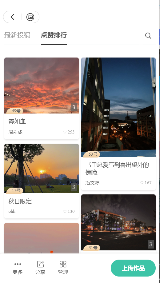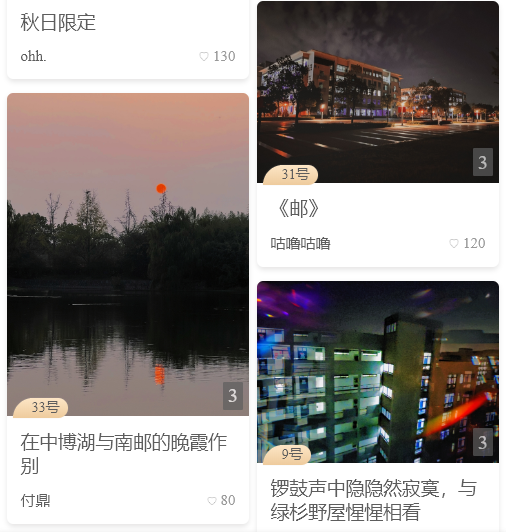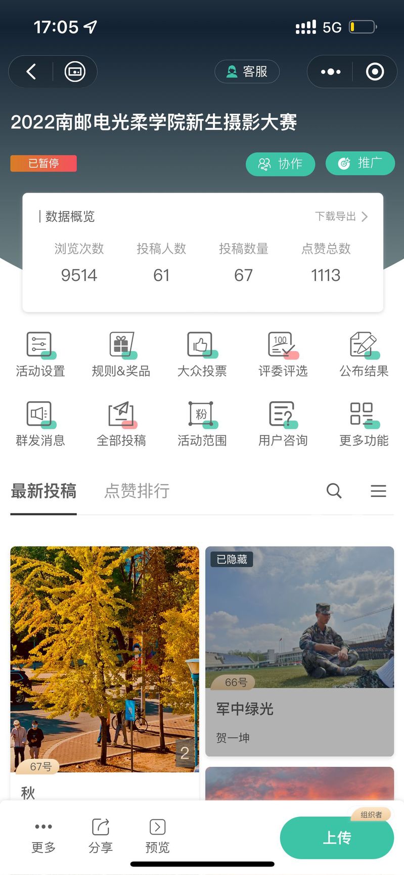 活动通过大一各团支部大力宣传,得到了新生们的积极响应,全年级共征集了67组作品。围绕“我与南邮初相遇”的主题,同学们通过微信小程序,可以快捷提交参赛作品及个人信息。同学们通过转发拉票,为自己的作品赢得支持,也提高了活动的知名度与参与度。投票截止后,大赛依照投票数选出一、二、三等奖,并由关工委张慈萍、严卯生老师推荐,选出五个特别提名奖。学院关工委为获奖同学颁发了创意礼品,并对获奖作品进行了展示与宣传。
