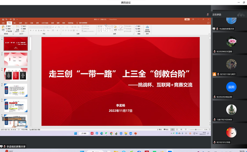 课程开始,李孟杨老师从大赛流程、大赛精神、信息渠道等方面进行了详细的大赛介绍。紧接着,李老师以PPT的形式呈现本次课程,强调了参赛同学要仔细阅读大赛通知,关注赛道、组别、资格等相关材料。随后,李老师结合视频、商业计划书、参赛者的参赛经历,带领同学们了解竞赛的各组评分标准,之后还提出网评材料、赛事准备、路演技巧方面的建议。