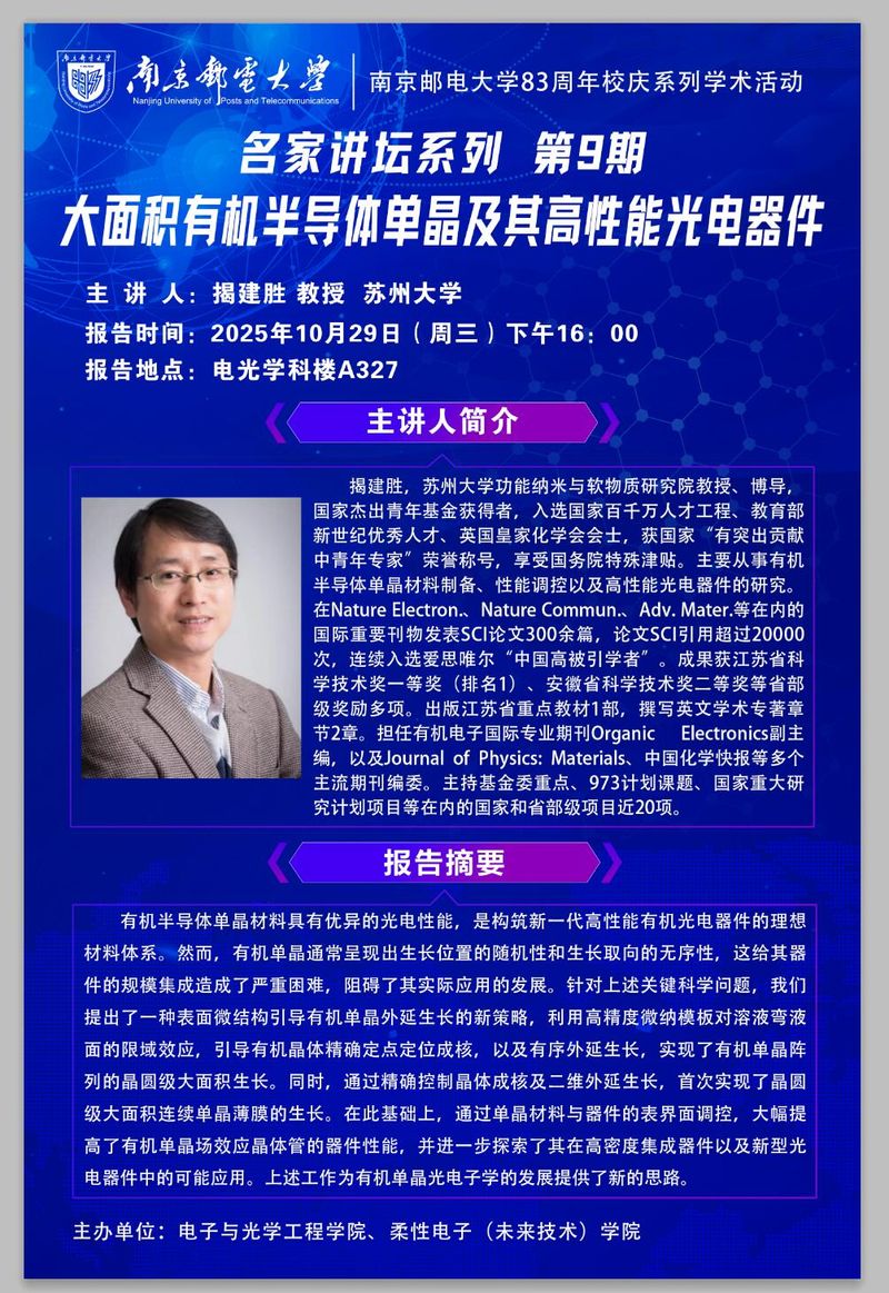学术报告:大面积有机半导体单晶及其高性能光电器件