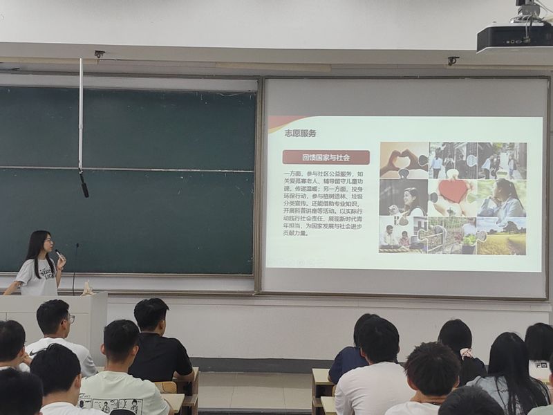 在宣讲的最后一部分,马梅颖结合自身经历,分享了志愿服务与感恩回馈的故事,传递“受助思源、感恩奋进”的理念。她表示,作为学校资助政策的受益者,自己始终牢记“用行动传递温暖,用知识回馈社会”,先后参与了校运会开幕式志愿者、校合唱比赛、云支教等多项活动。希望大家在享受政策关怀的同时,能主动承担社会责任,将所学知识转化为服务社会的能力,带着感恩之心前行,成长为有温度、有担当的新时代青年。