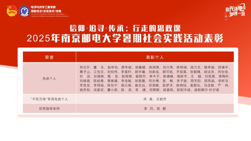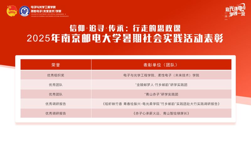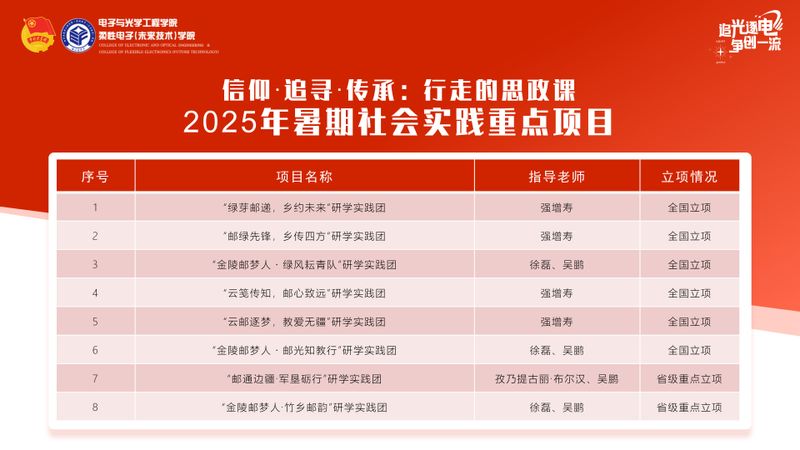 2025年,学院深入学习贯彻习近平总书记关于青年工作的重要思想,以“行走的思政课”为理念,结合学院“信仰·追寻·传承”主题思政课,围绕“强国复兴有我·青春实践筑梦”主题,组织开展了多层次、宽领域、高质量的大学生社会实践活动。暑期共组建实践团队265支,由304永利集团官网入口、柔性电子(未来技术)学院党委副书记、副院长徐磊担任“信仰·追寻·传承”主题思政课授课教师。参与师生达2000余人次,足迹覆盖全国28个省(市、自治区),获评省级以上立项实践项目8项,相关事迹被中国日报网、人民公开课等国家级媒体报道,实现了实践育人与社会服务的深度融合。