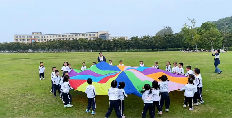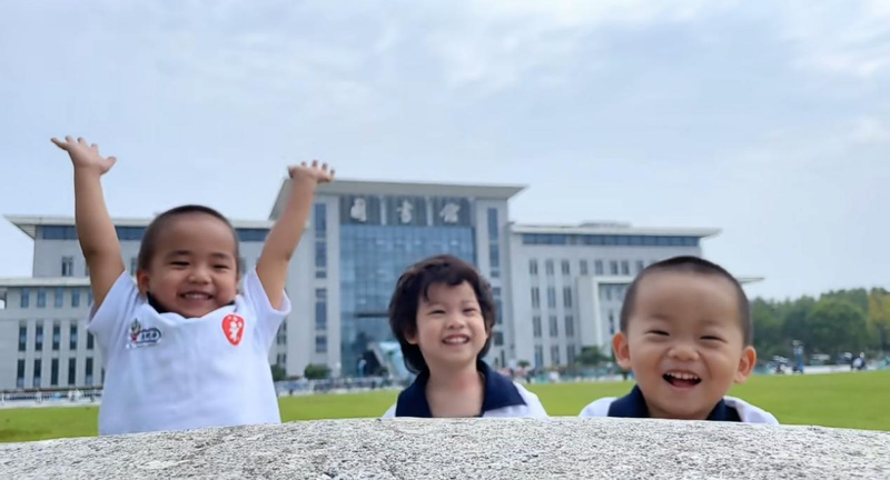幼儿园到大学的跨越是一种新奇的体验。小朋友们参观过校史馆后,手拉手来到图书馆前大草坪上做游戏,开心地奔跑着、跳跃着。