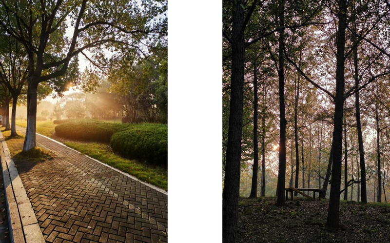 晨雾伴着阳光,如薄纱漫过草坪;微风掠过草尖,与树影悄然交织。