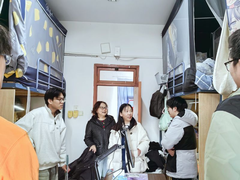 在大四学生宿舍,黄书记、徐书记与同学们进行了亲切交谈。她们详细询问了毕业生们的学业进展、就业落实情况以及研究生入学考试的备考状态。针对正在积极求职的同学,两位书记认真了解了他们的就业意向、遇到的困难,并给予了积极的建议和鼓励,表示学院将持续提供就业信息推送、面试指导等全方位支持。对于紧张备战考研的学子,领导们关切地提醒大家要劳逸结合,保持良好的身心状态,以最佳姿态迎接挑战,并表示学院是同学们的坚强后盾。同学们也纷纷分享了各自的近况与规划,对学院领导的关心表示感谢。