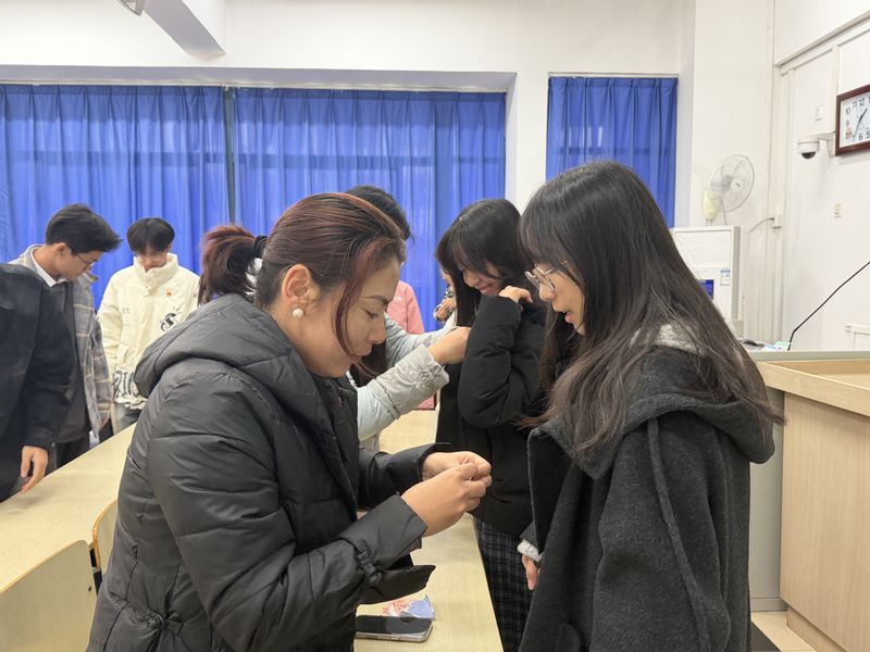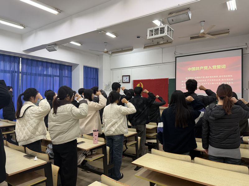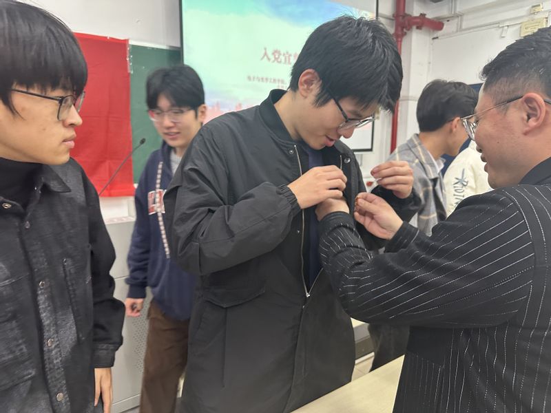 活动在新发展预备党员入党宣誓仪式中拉开帷幕,全体成员肃立齐唱《国际歌》,在激昂旋律中凝聚信仰力量。党支部书记梁博带领新发展党员面向党旗庄严宣誓。学生代表徐硕结合“信达天下,自强不息”的南邮精神作表态发言,承诺将通过加强理论学习、深耕专业领域、积极服务集体来践行初心。梁博勉励全体新发展党员,要将入党誓词内化于心、外化于行,在勇担使命中淬炼党性、成长成才。仪式最后,梁博、祝腾、孜乃提古丽·布尔汉三位教师党员为新发展党员逐一佩戴党员徽章。