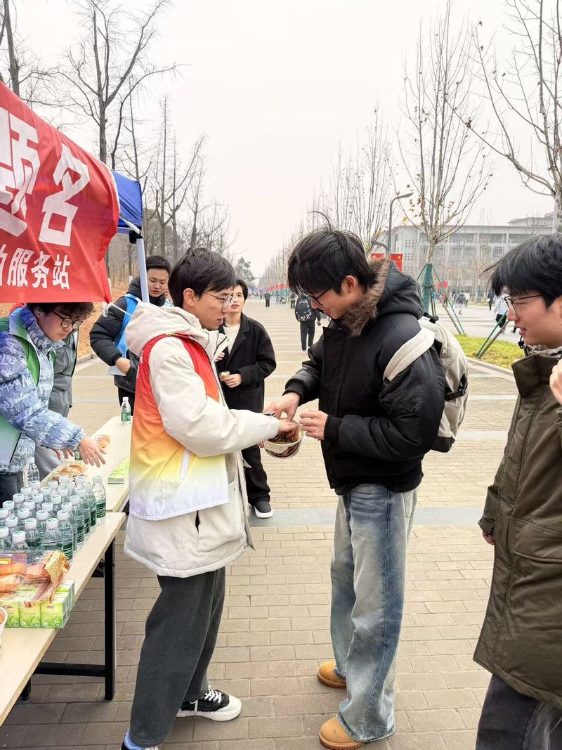 在学院党委副书记徐磊的带领下,各党支部老师们、志愿者们,面带微笑主动迎向考生,将饱含关怀的物资递到他们手中。“天儿冷,贴个暖宝宝暖身,答题更顺手!”“喝杯热豆浆暖暖胃,保持好状态!”一句句朴实的叮嘱搭配“金榜题名”“一战成硕”的真挚祝福,温暖驱散了学子们考前的紧张与冬日的寒意。