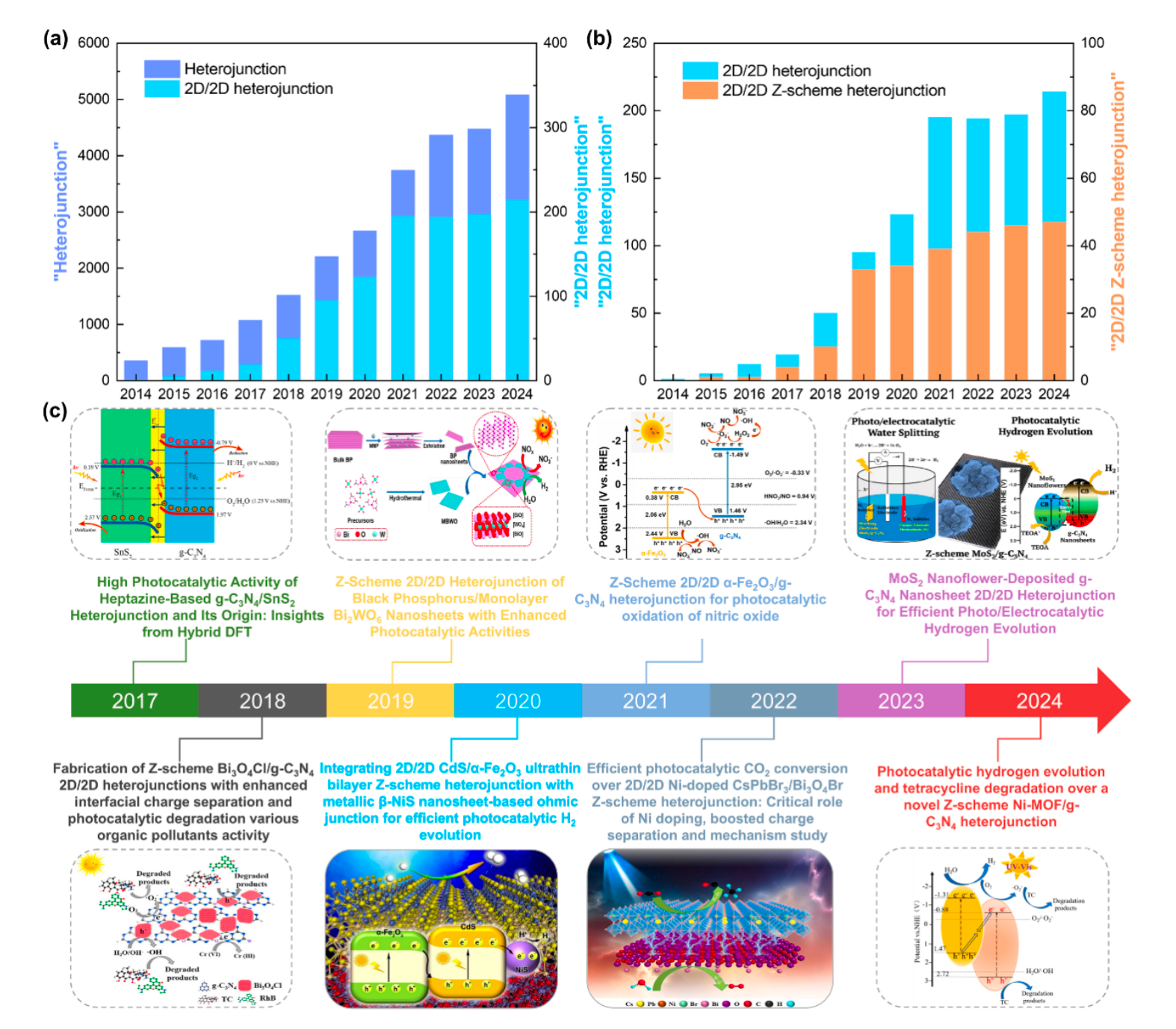 图2:二维Z型异质结研究的趋势。图2a:展示了过去10年中涉及“异质结”和“二维异质结”的论文数量增长趋势。自2014年以来,相关论文数量显著增加,表明二维异质结研究中的应用越来越受到关注。图2b:展示了“二维异质结”和“二维Z型异质结”的论文数量增长趋势,说明二维Z型异质结已成为光催化领域的重要研究热点。图2c:列举了近年来二维Z型异质结的代表性工作,进一步揭示了该领域的发展轨迹和研究重点:基于多样化的二维材料,结合精细界面构造、助催化剂改性和掺杂等策略,深入研究和利用直接Z型电荷转移机制,实现高性能光催化能量转换与化学合成。