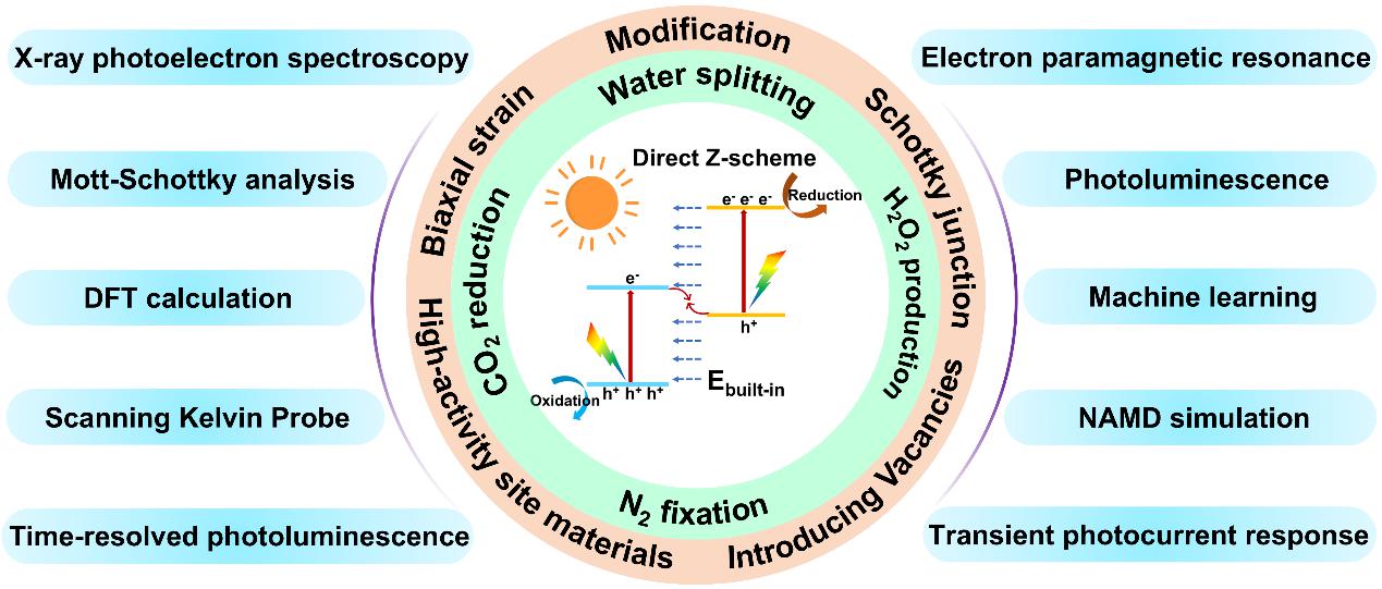 图1二维直接Z型异质结在四个关键能量转换和化学合成应用中的最新进展:光催化分解水、CO2还原、N2固定和H2O2合成。为了提升催化活性、选择性和稳定性,广泛采用了多种策略,如能带工程、界面工程、缺陷工程、应变工程以及活性位点修饰等。这些策略的有效性已通过多尺度表征技术得到验证,包括密度泛函理论计算、X射线光电子谱、莫特-肖特基分析、瞬态光电流/光致发光光谱和电子顺磁共振光谱等。
