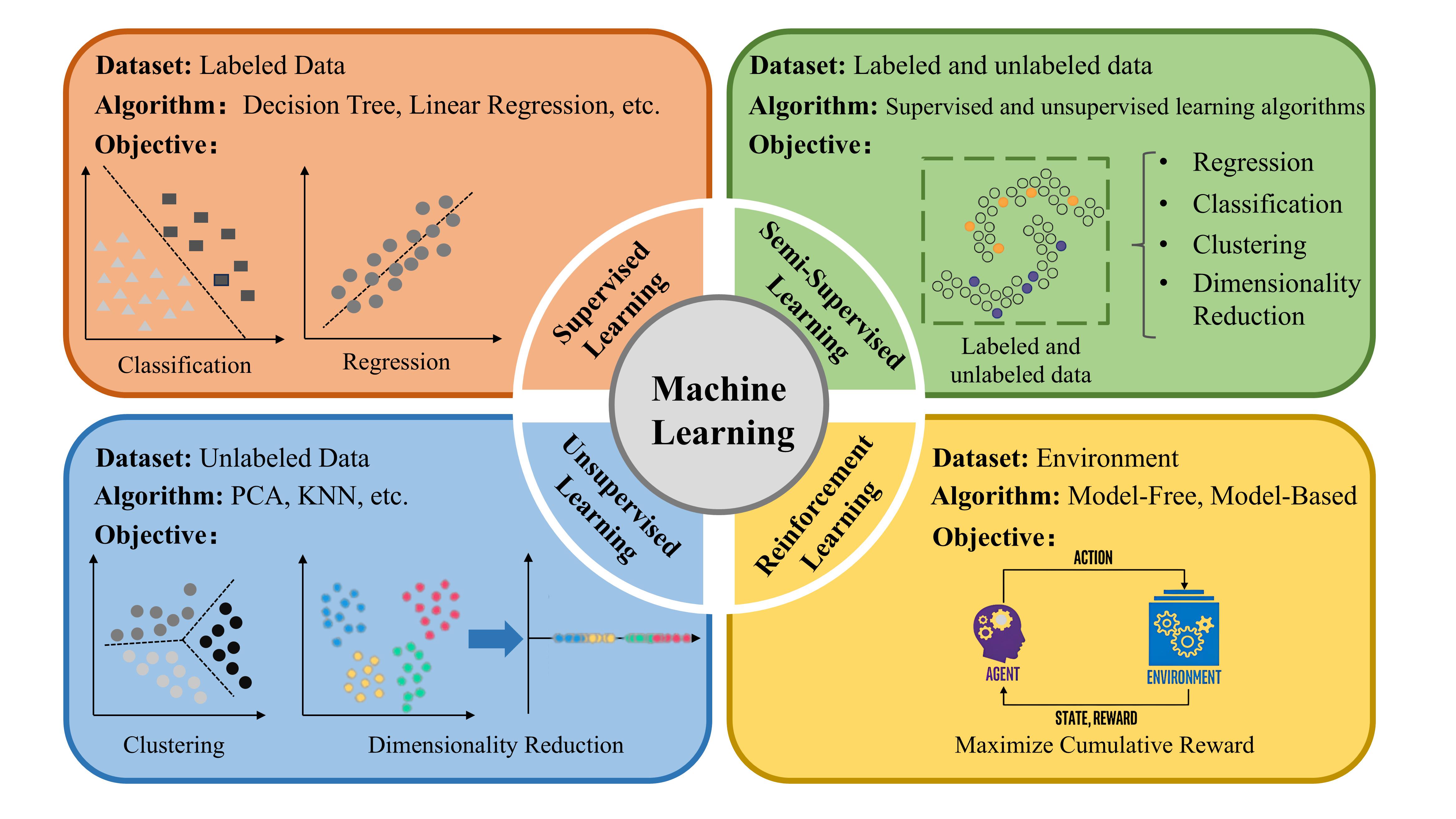 图2. 机器学习算法的分类及其应用。