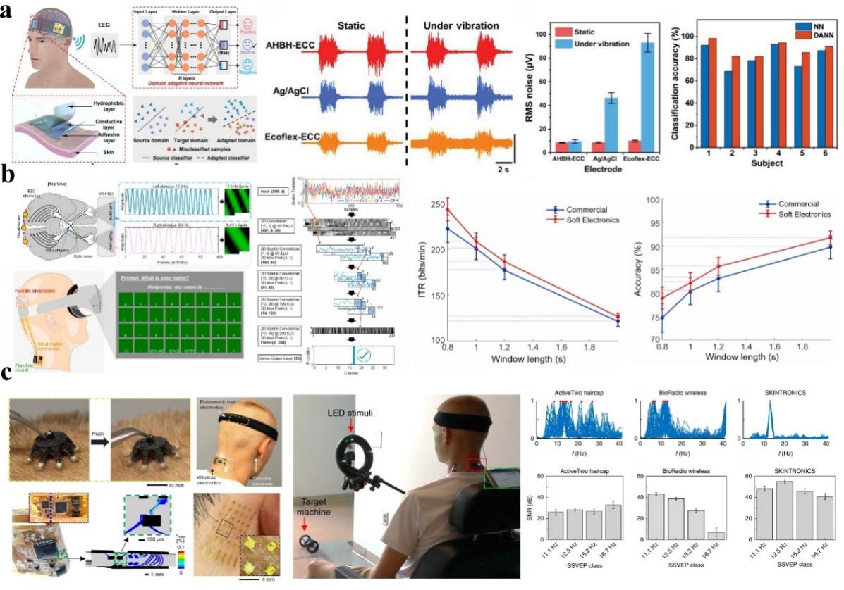 近年来,非侵入性脑机接口(BCI)的研究在神经科学、人工智能、柔性电子及系统工程等多学科交叉推动下取得重要进展。一方面,深度学习技术的突破显著提升了神经信号解码的准确性与鲁棒性;另一方面,柔性电子学的发展—特别是通过引入纳米结构导体等可拉伸材料与先进微纳加工工艺—使电极更贴合头皮,大幅提升了穿戴舒适性、共形贴合能力及长期稳定性。然而,该技术走向实用仍面临关键瓶颈:脑电等信号易受生理与环境噪声干扰,信噪比低;且传统刚性电极难以在动态使用中保持稳定接触,导致信号衰减。此外,系统在跨被试者泛化、长期可靠性和复杂环境鲁棒性等方面亦有待加强。