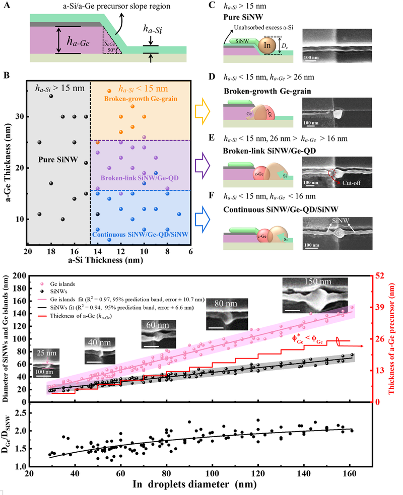 研究团队进一步系统揭示了sc-HPS机制下Ge-QDs形成的动力学过程,建立了基于前驱体供给量与催化液滴体积之间的定量关系模型,划定了实现连续SiNW/Ge-QD/SiNW异质结构的生长窗口。