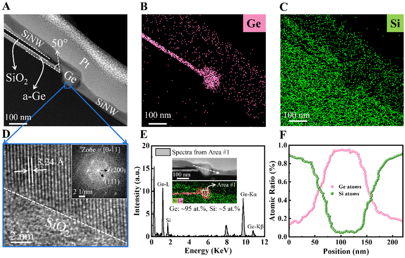 图2. SiNW中精确定位的Ge-QD的结构和成分表征。