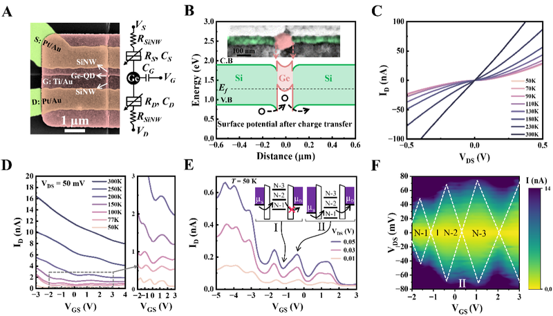 团队基于该SiNW/Ge-QD/SiNW轴向异质结构,利用Si/Ge之间的Type II带隙偏移实现空穴在Ge-QD内的强3D限域,成功制备出单空穴晶体管原型器件。电学测试表明,该器件在50K温度下呈现出显著的库仑阻塞振荡和清晰的库仑菱形特征,证实了Ge-QD对空穴的高效量子限域和稳定的单空穴充电行为,提取的器件充电能量约14 meV,与理论计算高度吻合。对比实验进一步证明,器件的单空穴特性来源于Ge-QD的量子限域效应,而非SiNW。